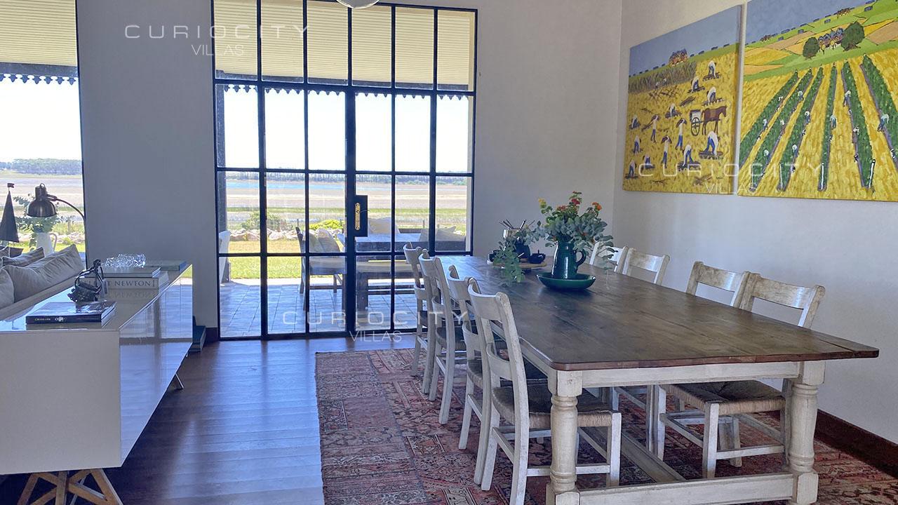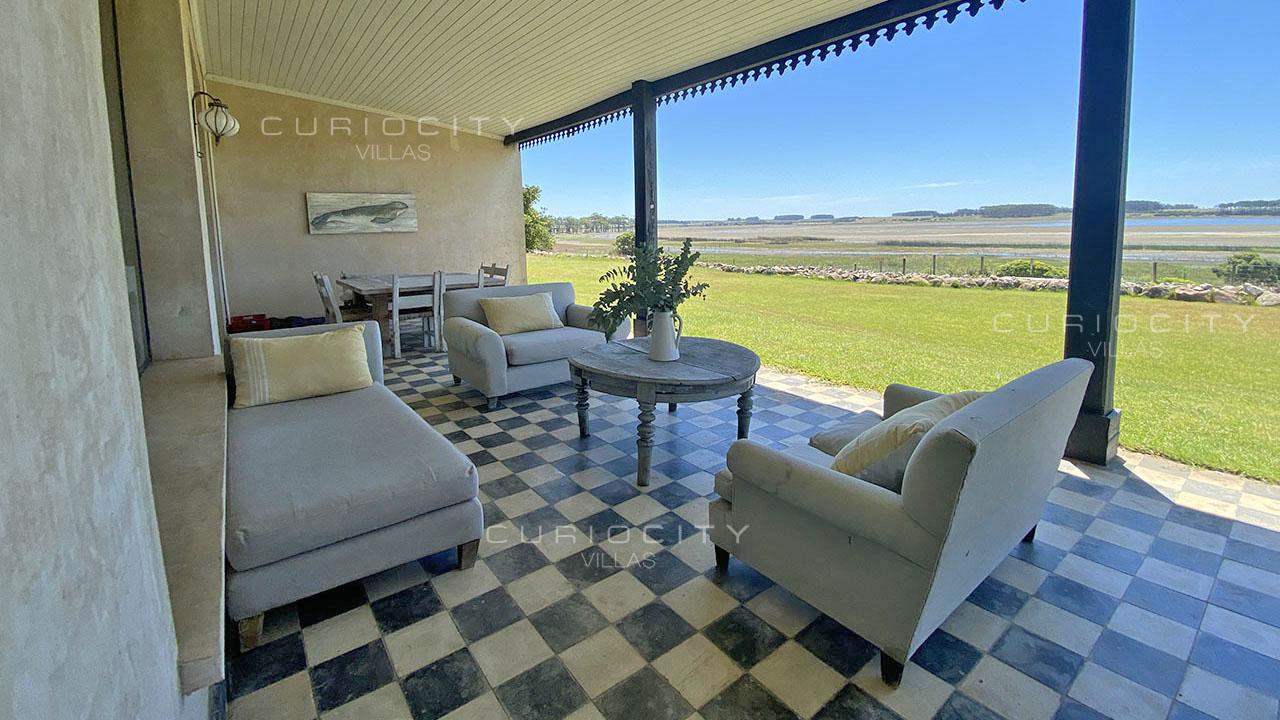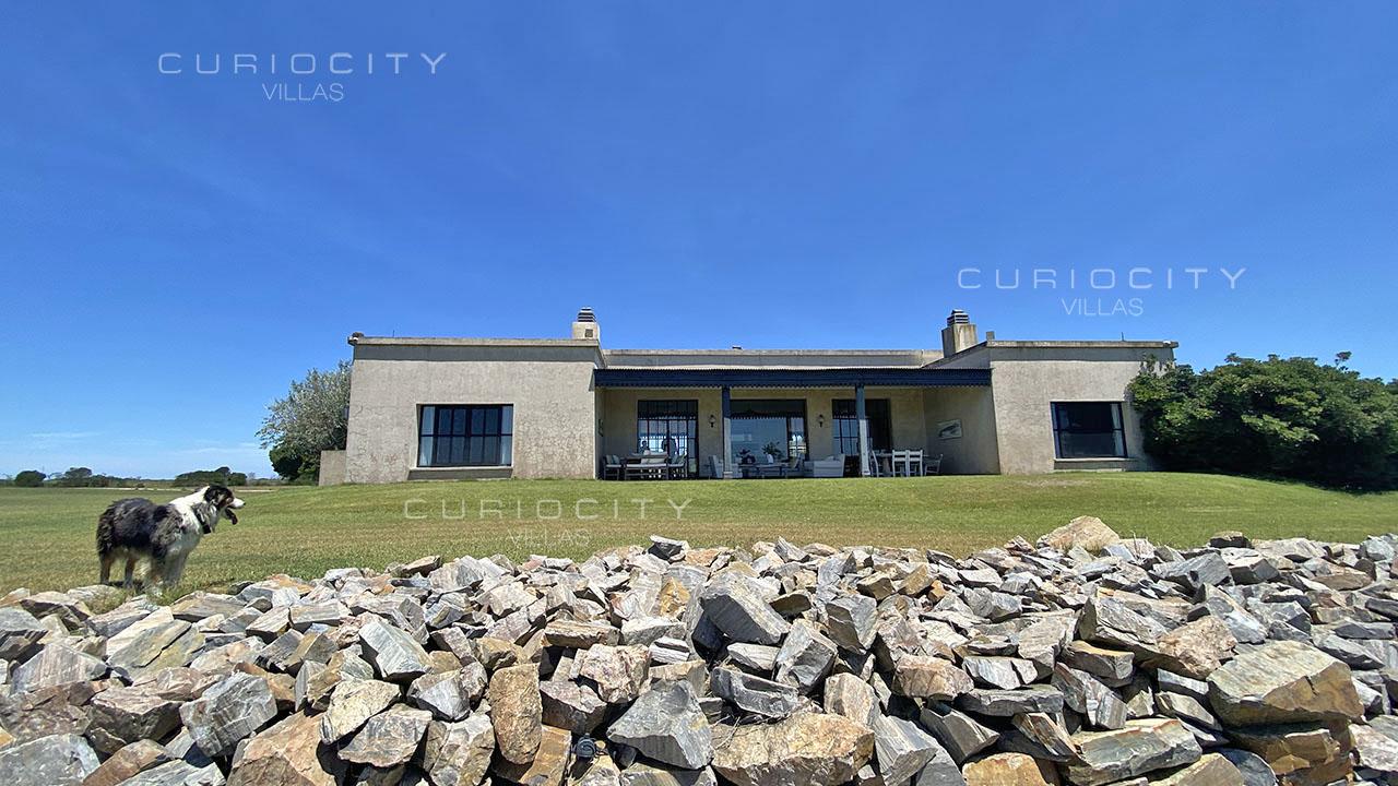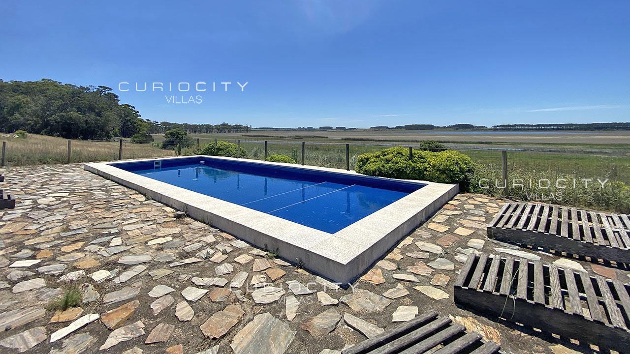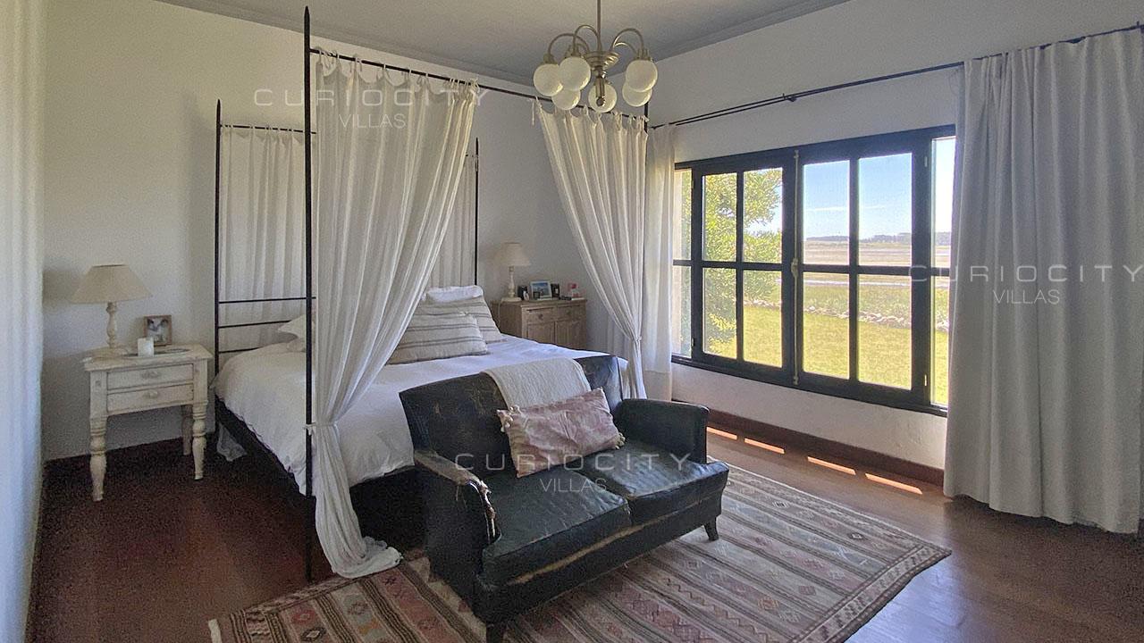 Charming countryside retreat set by the shores of Garzon Lagoon, with ten hectares of private lush gardens and just minutes away from the beautiful beaches, restaurants and the chic crowd of Jose Ignacio. The villa is designed in one level, with all the living areas cleverly distributed in order to make the living experience truly pleasurable. Its décor - a balance of vintage and contemporary furniture mixed with original and very unique countryside items, recreates a 1900's working ranch's cottage. The very heart of the house is a spacious living room and dining room, with floor-to-ceiling windows along both sides wide of the room that blends with two outdoor, furnished galleries and provides easy access to all the bedrooms of the house, as well as to the kitchen. The bedrooms have generous views of the lagoon, whispering trees and miles of virgin lands, private bathrooms, and are decorated in white linens with dots of color. Two of them have king-size beds and the other three are set with twins. The master bedroom has a small, private living, fireplace and walk in closet. The rest of the amenities include a large, seasonal swimming pool, with sun loungers and parasols, which is located in the middle of the backyard, half way between the rear gallery and the lagoon. There is also an organic orchard, 4 covered parking lots, and a separate house for the housekeepers with additional room for the hired help. This property provides a true encounter with Uruguayan nature, in a chic and relaxed atmosphere, with all the comforts and privacy needed for unique stays.